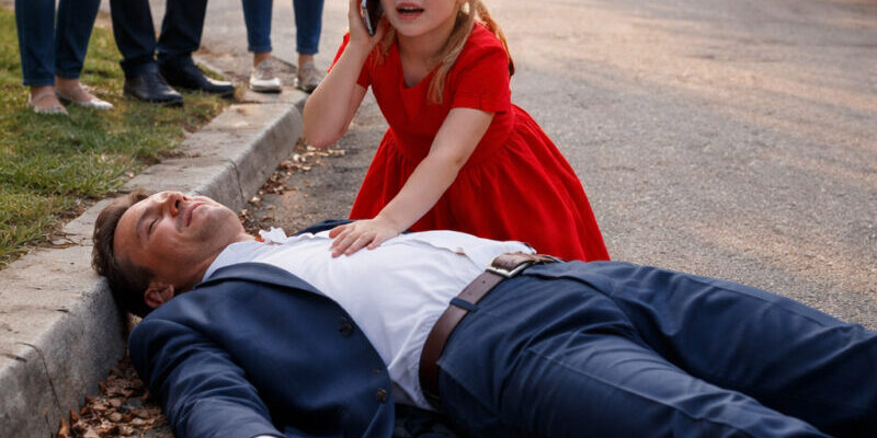 A six-year-old girl, dressed in a red dress, found a well-dressed man collapsed on a quiet street in the neighborhood… Adults were standing there, watching him… but no one reacted, until her phone call, spoken in a trembling voice, revealed the truth about this man that no one in that street expected 😲 😮